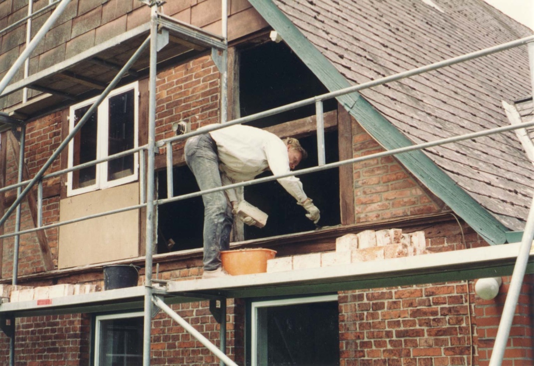 Beim restaurierenden Ausmauern des Fachwerks mit den alten Backsteinen