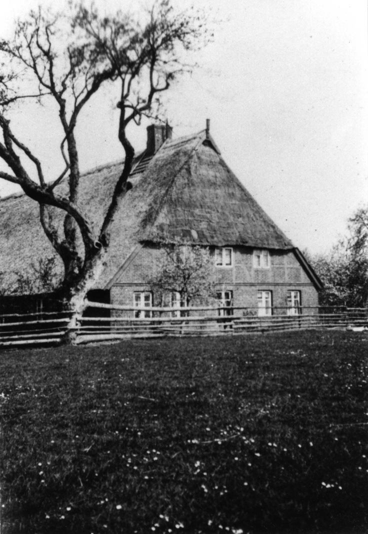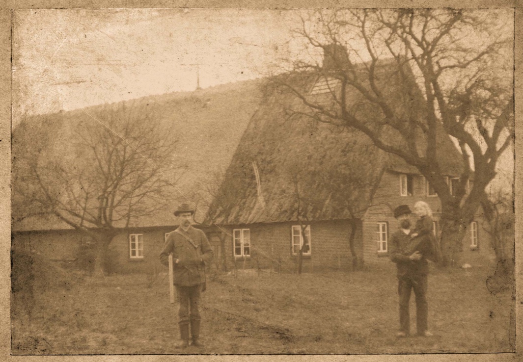 Wie üblich, erhielt das Haus damals ein Strohdach, unter dem sich der große Heuboden und im Süden eine Räucherkammer befand. Zwei mächtige Schornsteinzüge, die heute noch stehen, wurden zu einem Schornsteinkopf hochgezogen. Ein Foto, das meinen Urgroßvater August Baumann und seinen Stiefvater Johann Heinrich Peemöller mit meiner Großmutter Helene auf dem Arm zeigt, ist erhalten:
